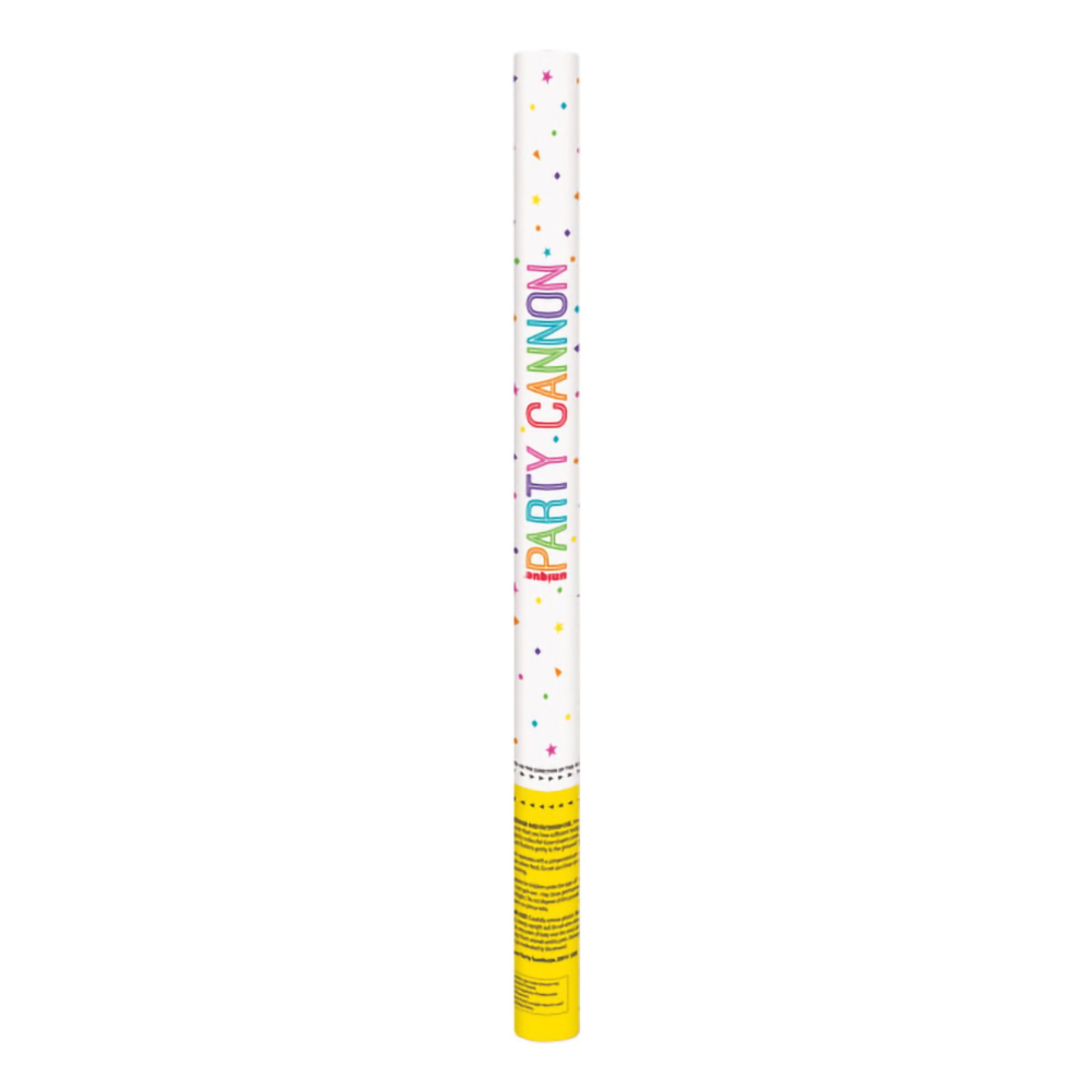 Konfettikanon Flerfärgad är ett papprör som skjuter konfetti i form av färgglada pappersremsor. Kanonen aktiveras genom att du vrider om nedre delen av röret. Observera att konfettin kan färga av sig om den kommer i kontakt med fukt.
