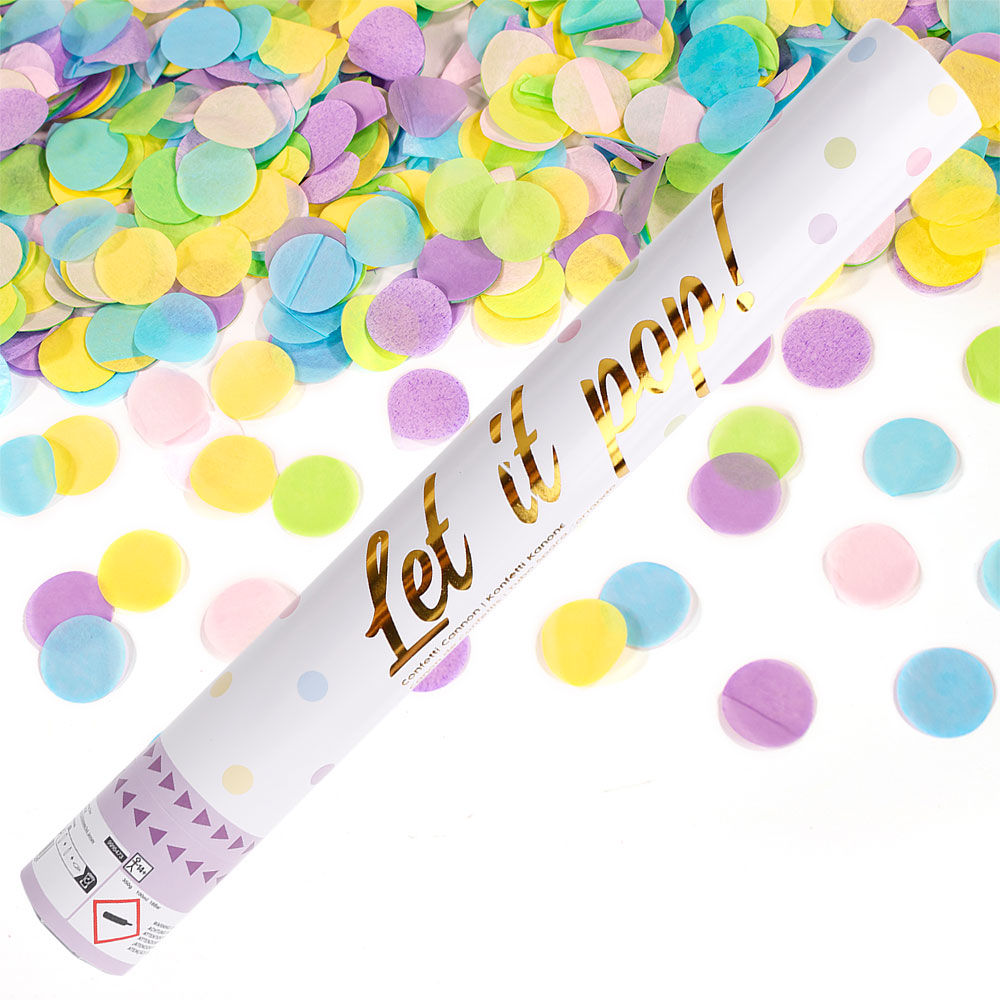 – Konfettikanon med flerfärgad pastell konfetti.