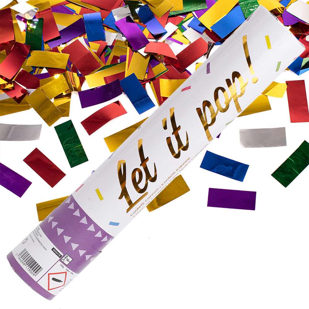 – Konfettikanon med rektangulär och flerfärgad konfetti.