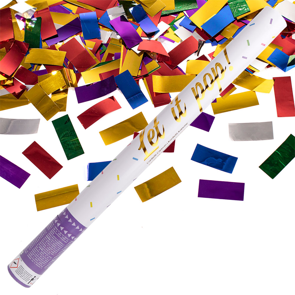 Konfettikanon Flerfärgad Rektangulärt Folie 60 cm omfattar en 60 cm lång konfettikanon med rektangulär och flerfärgad konfetti som konfettikanon skjuter ut med ett kraftigt lufttryck när man vrider på botten. Instruktioner finns på förpackningen.