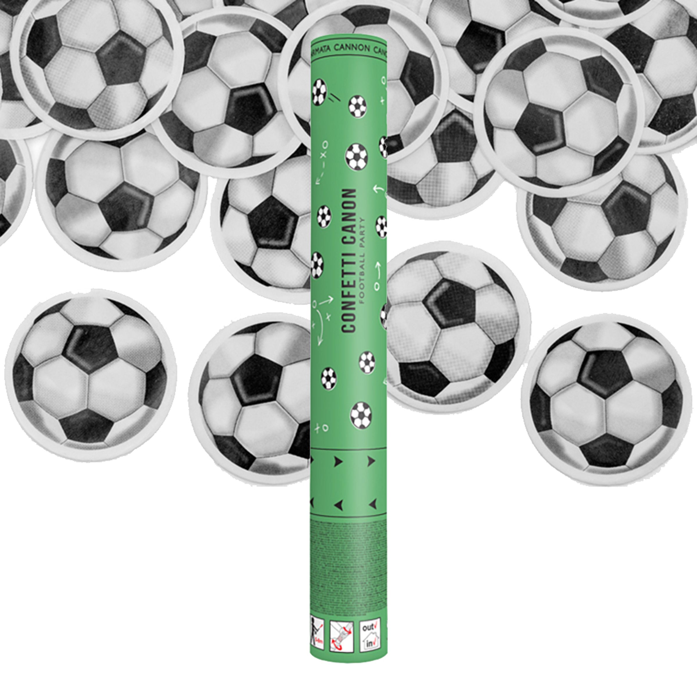 Konfettikanon Fotboll Party är en grön konfettikanon fylld med konfetti av pappersmaterial som ser ut som små svarta och vita fotbollar. Konfettikanonen är tillverkad i papp och den mäter 40 cm. Du aktiverar kanonen genom att vrida om nedre delen. Konfettikanonen kan användas inom- och utomhus. Ska inte riktas mot ansikten. Biologiskt nedbrytbar.