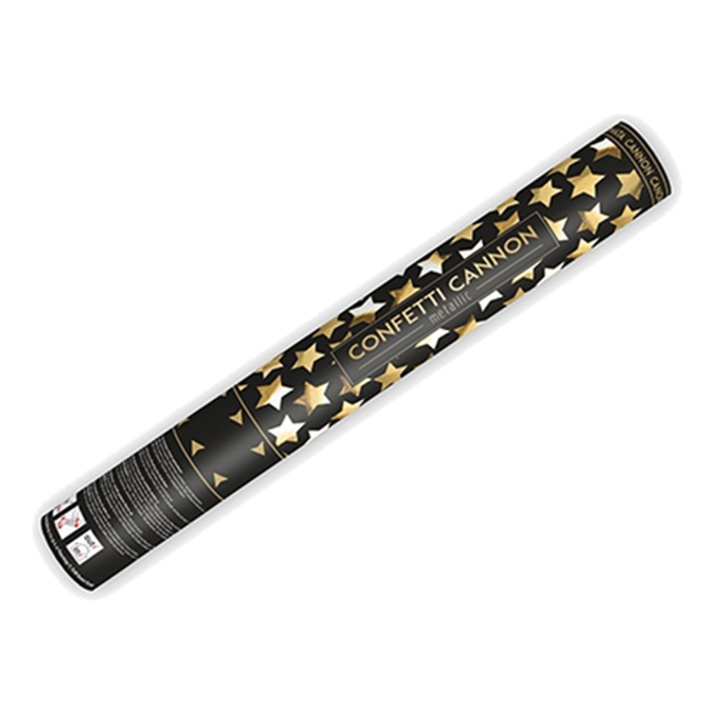 Konfettikanon som kastar ut små reflekterande guldfärgade folieskärnor ett par meter framför där du placerar den. Perfekt vid evenemang som bröllop eller nyår.