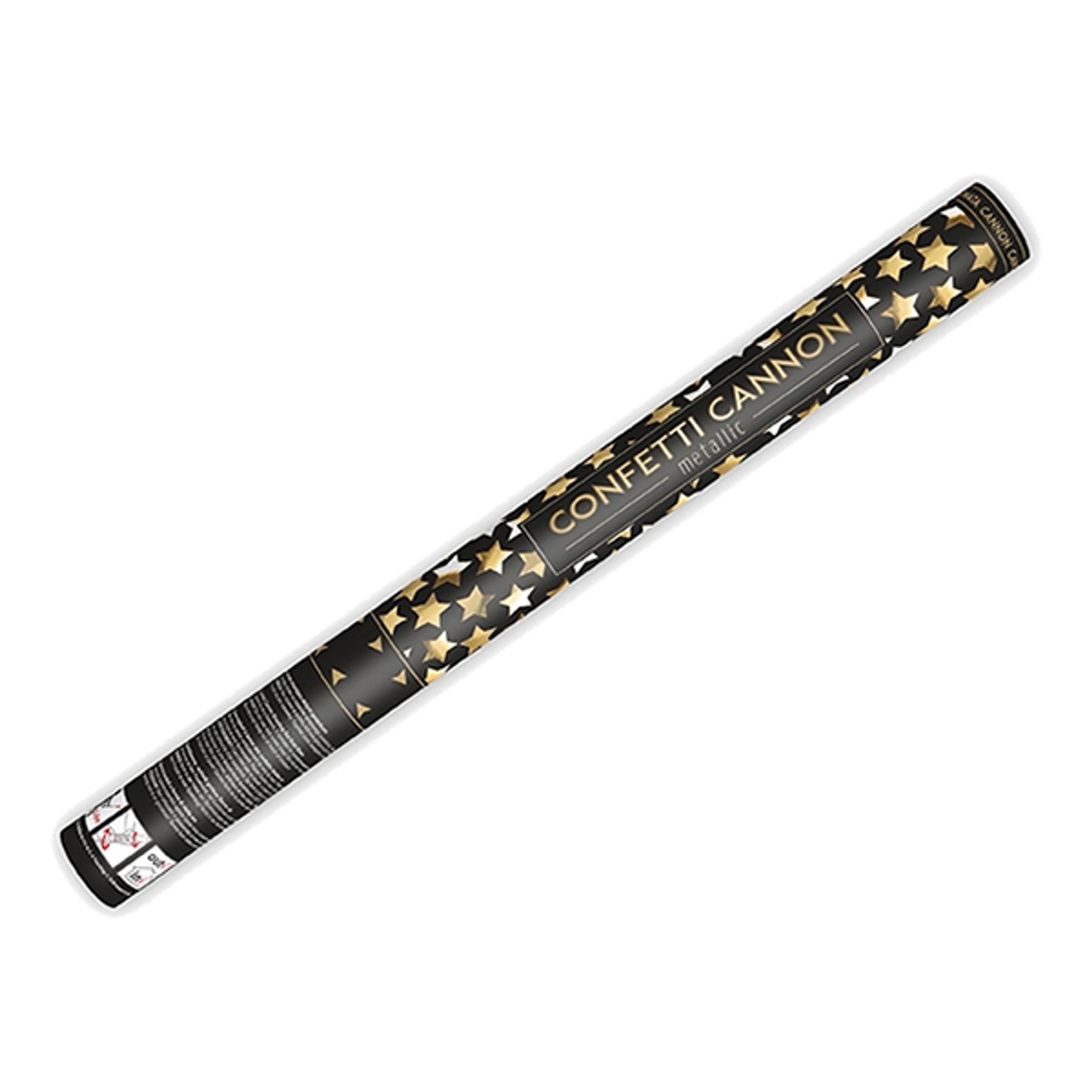 Konfettikanon som kastar ut små reflekterande guldfärgade folieskärnor ett par meter framför där du placerar den. Perfekt vid evenemang som bröllop eller nyår.