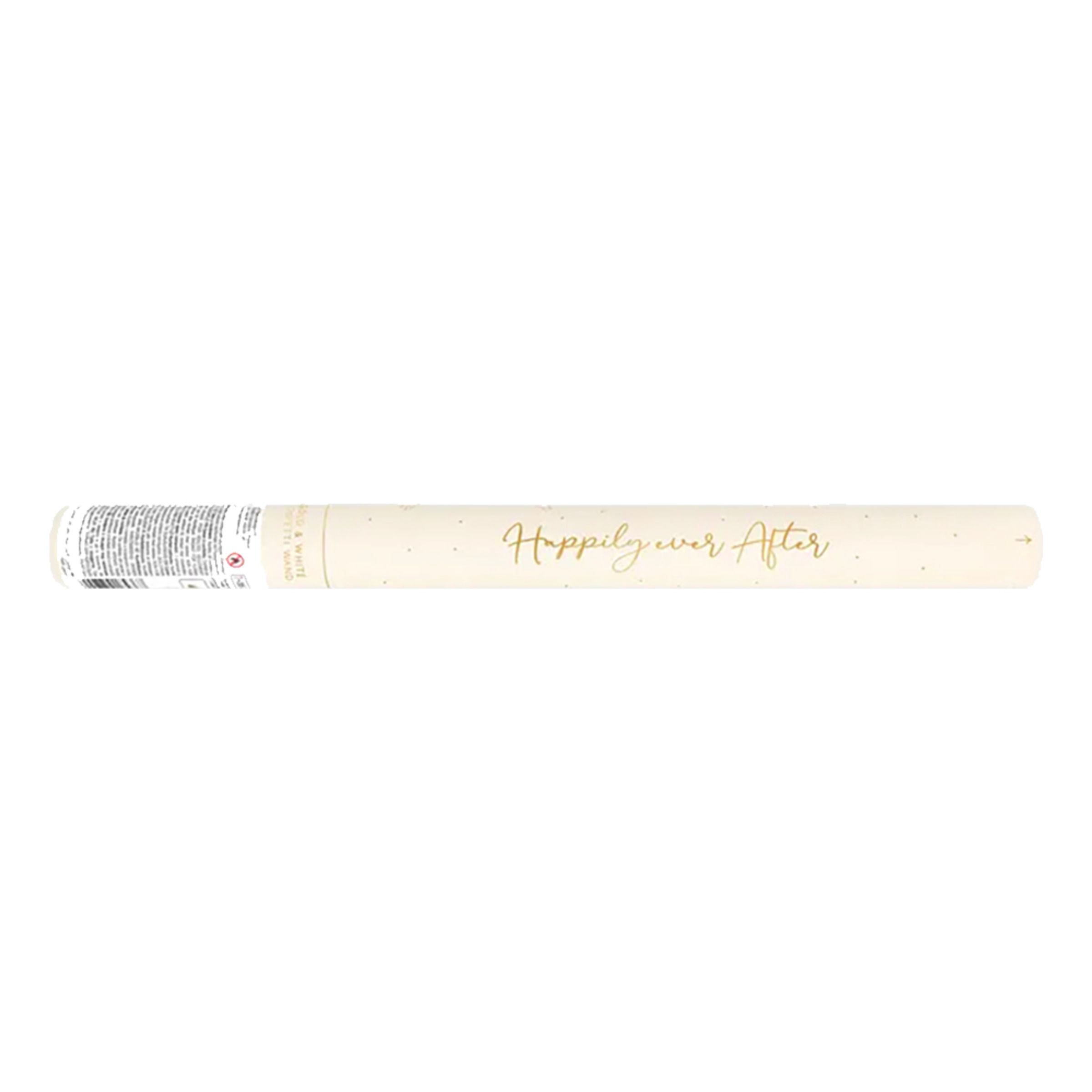 Konfettikanon Happily Ever After Guld/Vit är fylld med vita och guldiga rektanglar. På konfettikanonen står texten "Happily Ever After" och passar därför ypperligt till bröllopet.