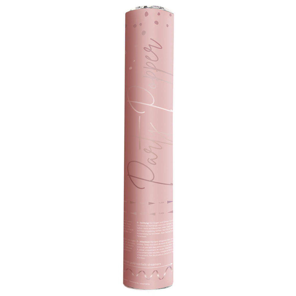 Konfettikanon Ljusrosa omfattar en ljusrosa konfetti kanon med roseguldiga detaljer och texten "Party Popper. Kanonen innehåller roséguldiga konfetti serpentiner. Instruktioner för användning finns på förpackningen.
