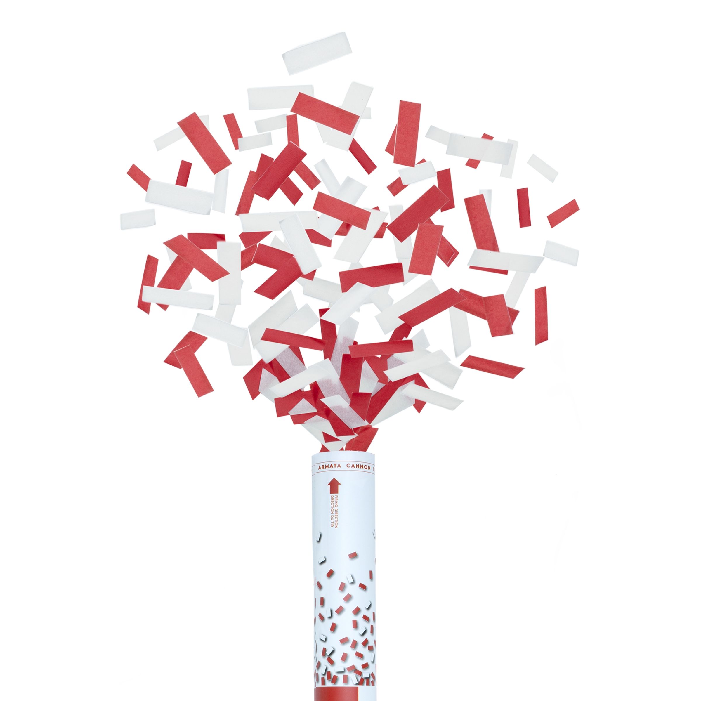 Konfettikanon Röd/Vit innehåller ett rör proppat med rödvit konfetti. Röret mäter 60 cm och aktiveras genom att vrida botten.