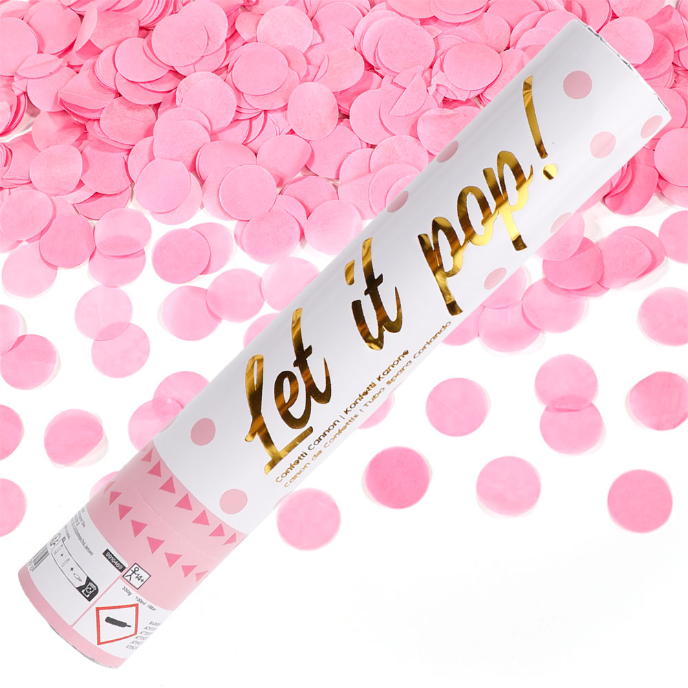 Konfettikanon Rosa 28 cm omfattar en 28 cm lång konfettikanon med rund och rosa konfetti som konfettikanon skjuter ut med ett kraftigt lufttryck när man vrider på botten. Instruktioner finns på förpackningen.