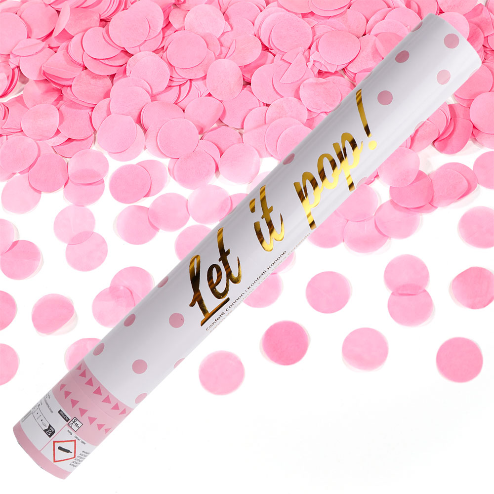 Konfettikanon Rosa 40 cm omfattar en 40 cm lång konfettikanon med rund och rosa konfetti som konfettikanon skjuter ut med ett kraftigt lufttryck när man vrider på botten. Instruktioner finns på förpackningen.