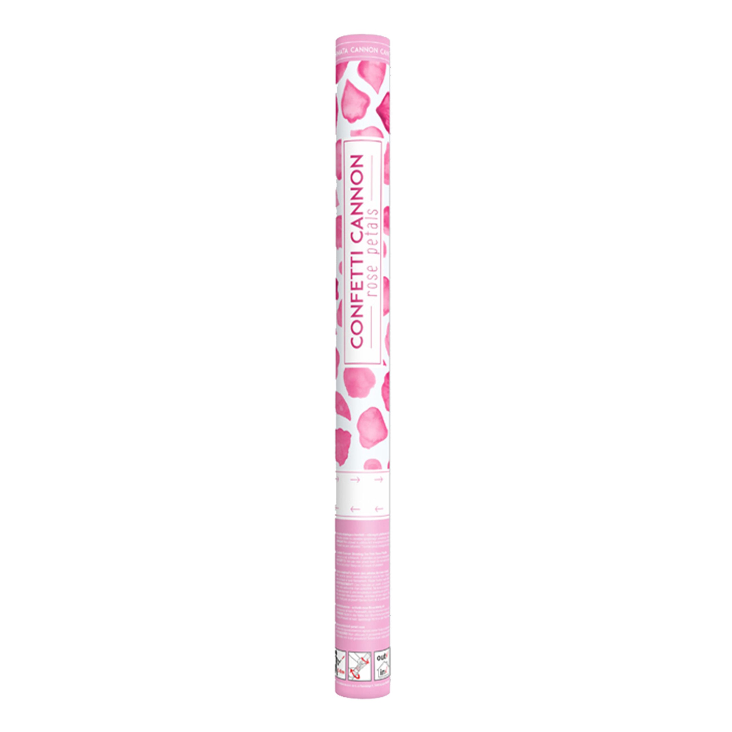 Konfettikanon Rosenblad Rosa är en kanon som skjuter ut rosa rosblad tillverkade i polyester. Du aktiverar den genom att vrida på den nedre delen. Instruktioner finns på förpackningen. Konfettikanonen kan användas utomhus och inomhus i stora rum.