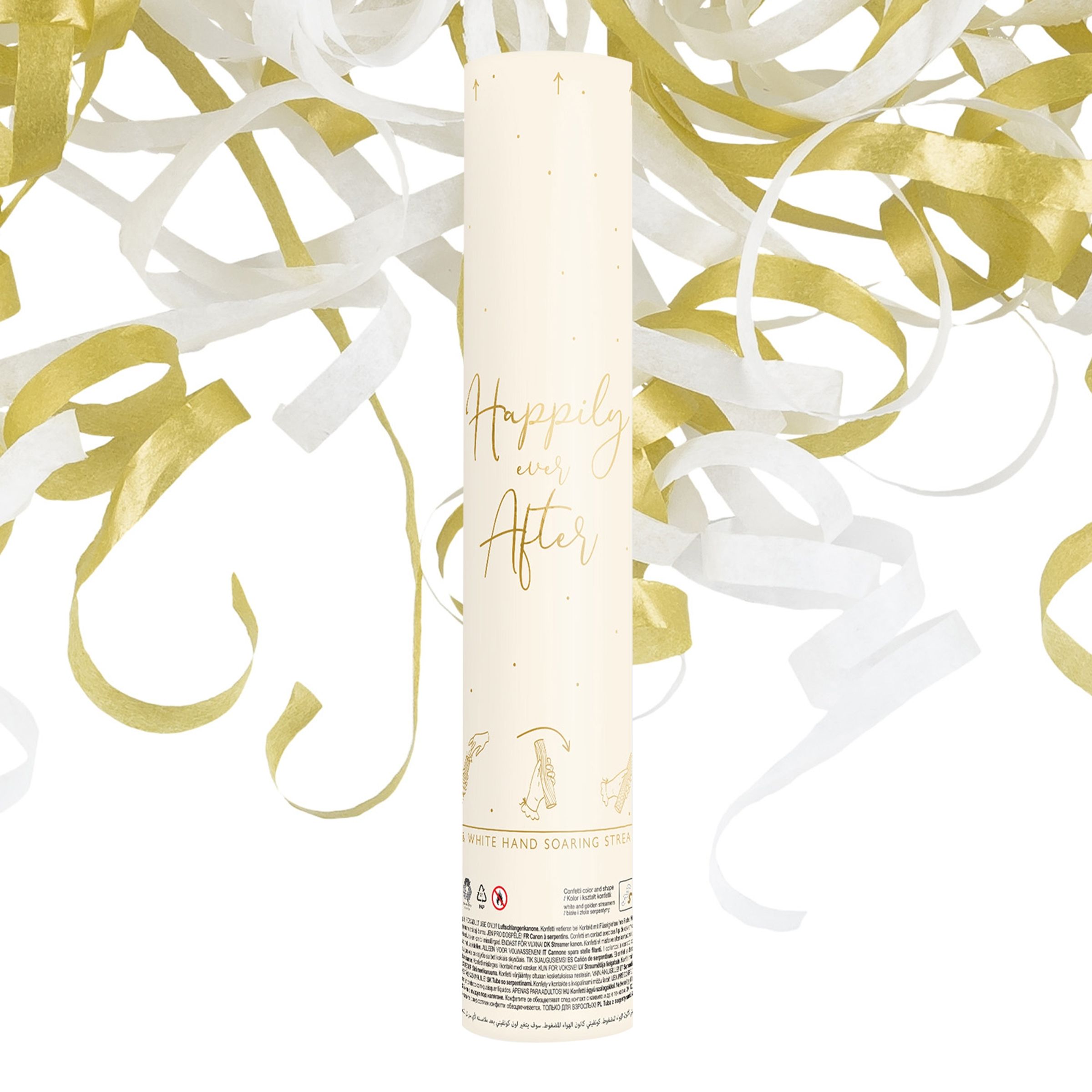 Konfettikanon Streamers Happily Ever After Guld/Vit är fylld med vita och guldiga långa strimlor. På konfettikanonen står texten "Happily Ever After" och passar därför ypperligt till bröllopet.