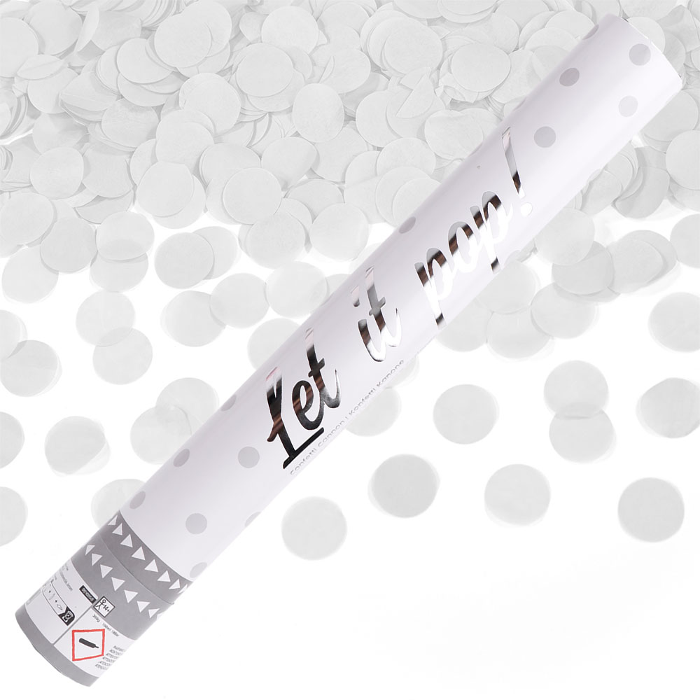 Konfettikanon Vit 40 cm omfattar en 40 cm lång konfettikanon med rund och vit konfetti som konfettikanon skjuter ut med ett kraftigt lufttryck när man vrider på botten. Instruktioner finns på förpackningen.