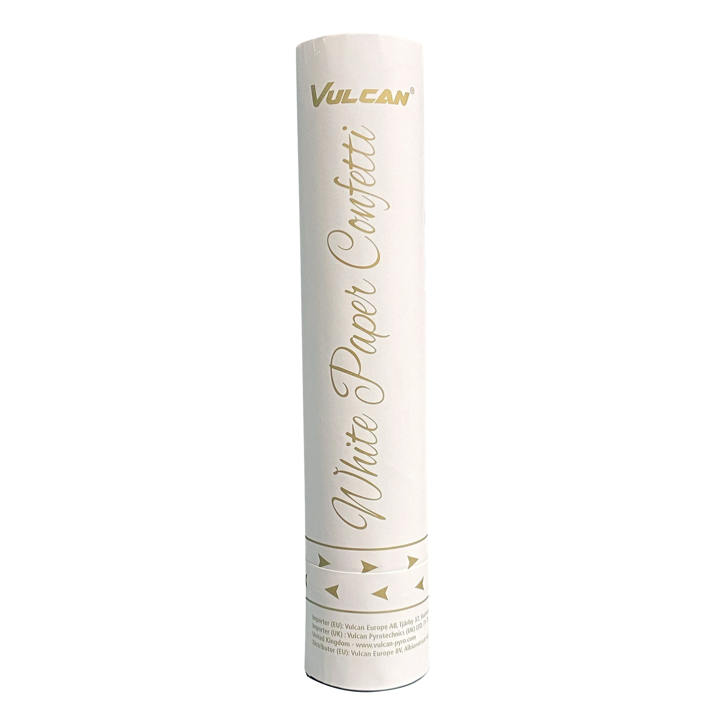 Konfettikanon Vit är en konfettikanon med vitt papperskonfetti som enkelt avfyras genom att vrida på handtaget längst ner. Konfettin slungas ungefär 5-8 meter upp i luften vilket gör att den passar bäst i stora lokaler.