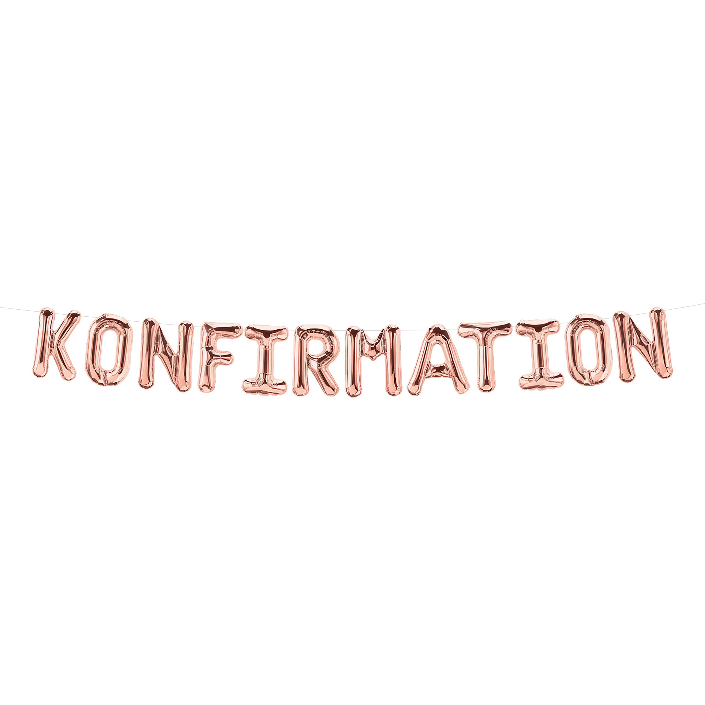 Konfirmation Ballonggirlang Roséguld är en roséguldfärgad girlang av folieballonger som tillsammans bildar ordet "konfirmation". Använd en ballongpump för att fylla ballongerna med luft. Trä snöret genom öglorna på ballongerna och häng upp dom på önskad plats.