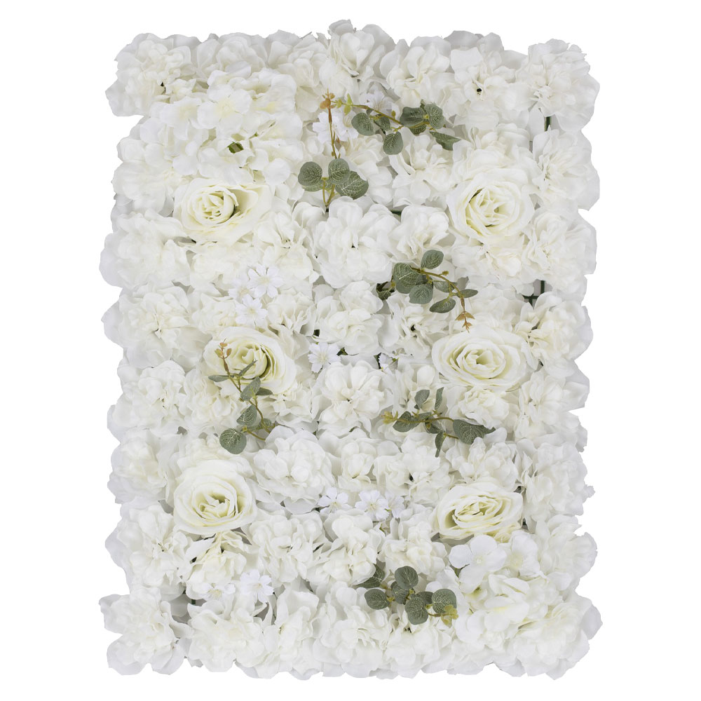 Konstgjord Rosvägg Vit A Touch of Pampas omfattar en blomvägg med konstgjorda vita rosor och gröna eukalyptuskvistar. Blomväggen är ca 60 cm hög och 40 cm bred och kan användas både inomhus och utomhus. Köp flera stycken och fäst dem i varandra för större väggar.