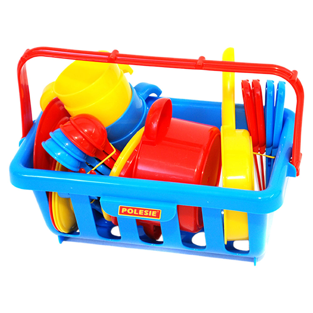 Korg med Köksleksaker omfattar en korg med leksaks tallrikar, gafflar, knivar, muggar, stekpanna och kastrull. Kommer i två olika färger. Vilken färg du får slumpas.