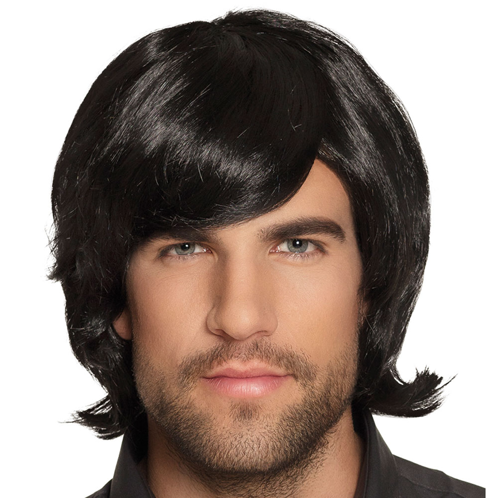 Kort 70-tals Peruk Svart består av en kort svart peruk med sned lugg.