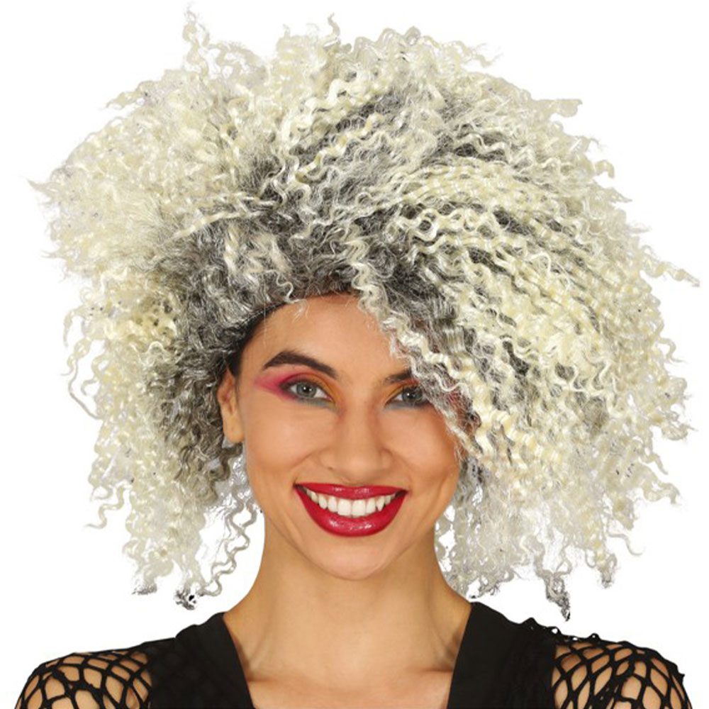 Kort Lockig Peruk omfattar en kort peruk med lockigt hår i svart, vit och blond färg.