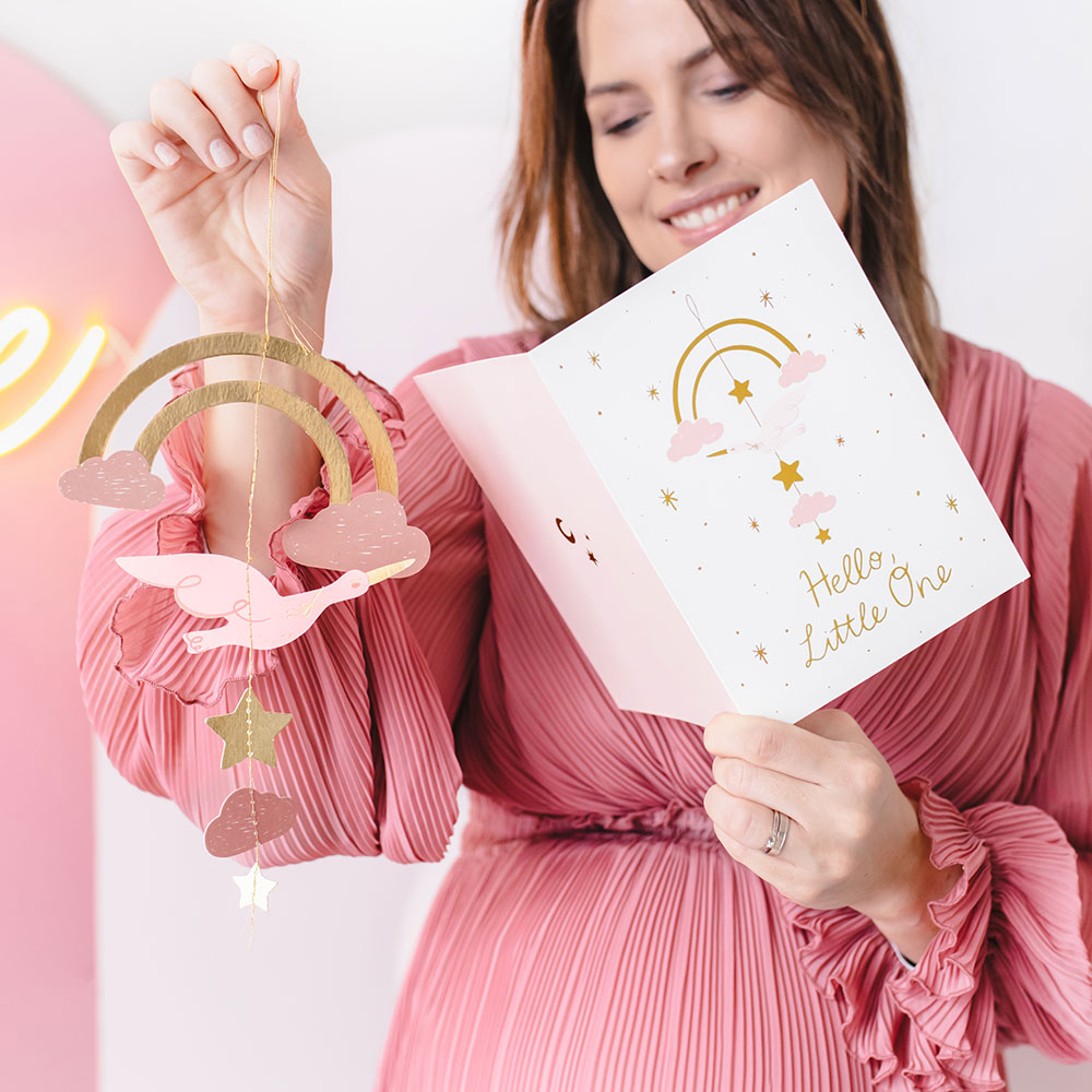 Låt ditt babyshower lyfta med denna förtjusande Babyshower-dekoration: Kort med Hängande Dekoration Rosa Stork. Denna söta dekoration kan hängas över partyområdet, och tillhörande babyshower kort ger ett personligt uttryck till händelsen. Med en ikonisk rosa stork, himmelska stjärnor och moln samt en strålande gyllene regnbåge, skapar denna dekoration ett drömliknande scenario för din babyshower. Inkluderar ett detaljrikt rosa kort som säger "Hello, Little One", vilket gör det till ett sött minne för den blivande mamman.