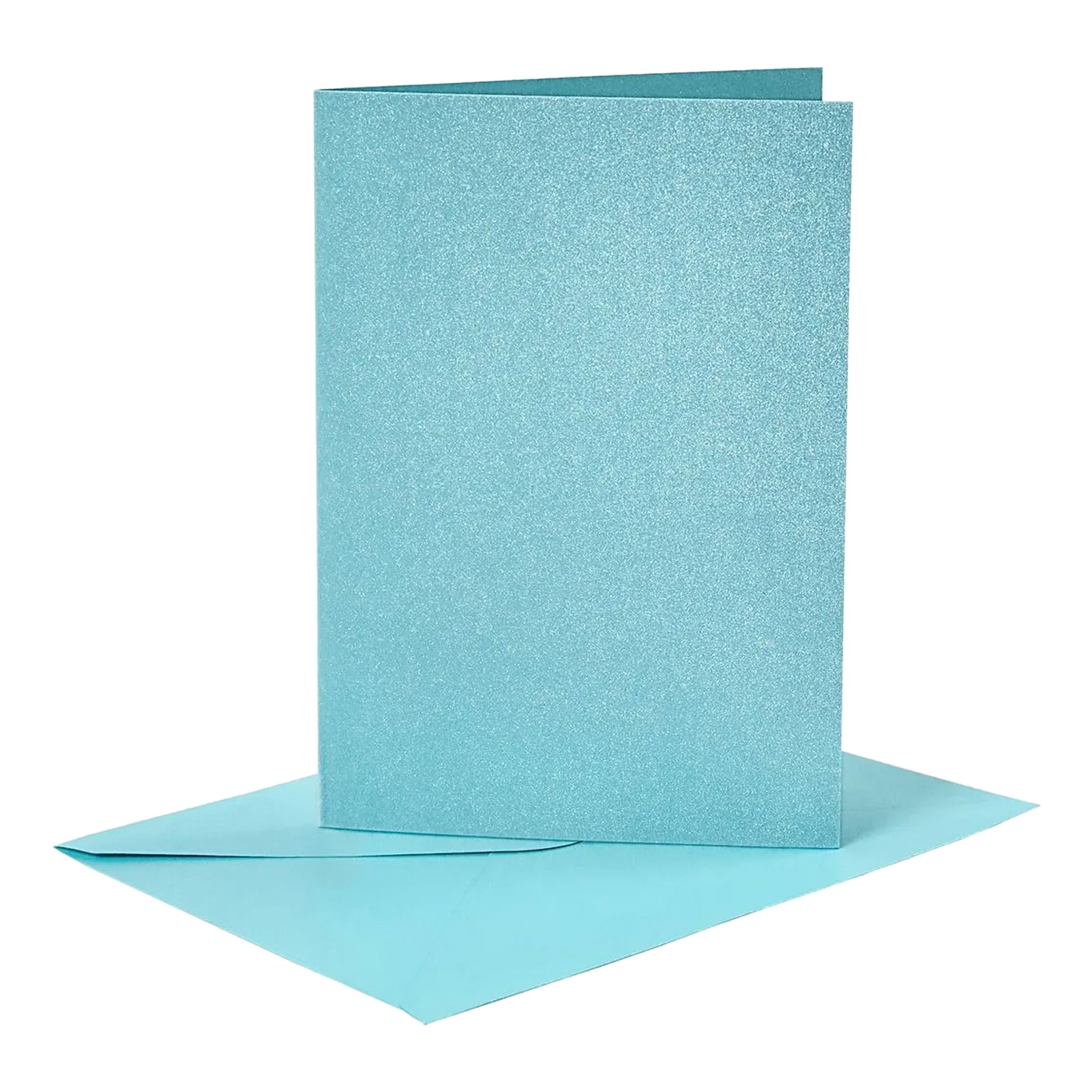 Kort med Kuvert Blå Glittrigt inkluderar fyra dubbelvikta kort med matchande kuvert. Korten och kuverten har en fin blå nyans och en glittrig yta.