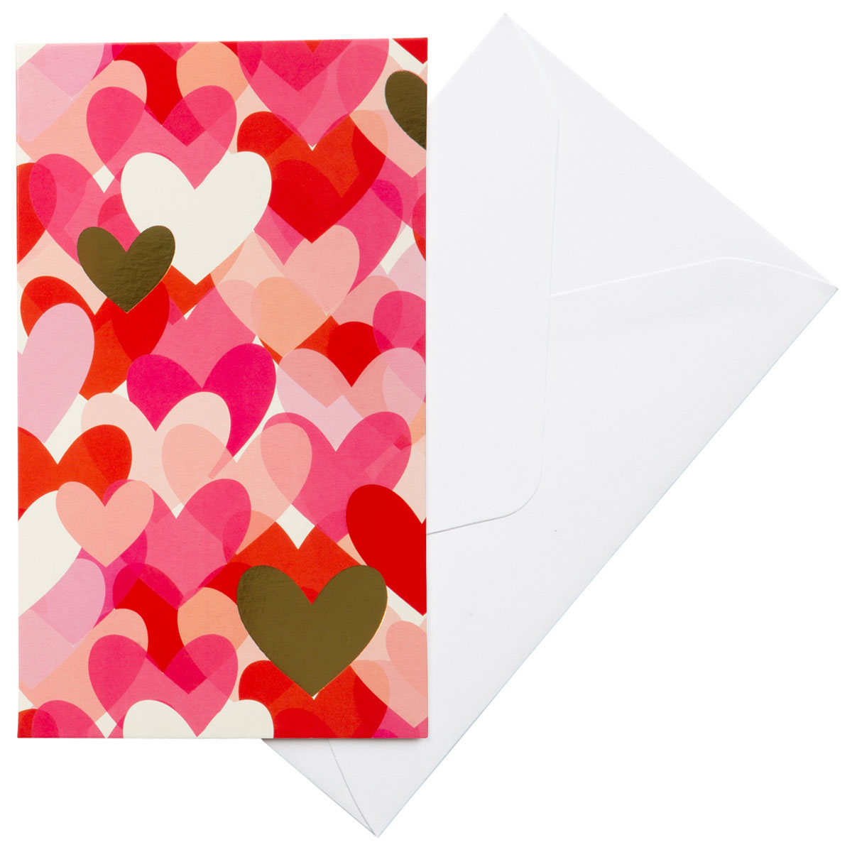 För alla hjärtans dag blir detta kort med tillhörande kuvert, perfekt för att uttrycka kärlek. Dekorerat med vackra hjärtan i rött, rosa och guld, ger det en elegant touch till varje kärleksbudskap.