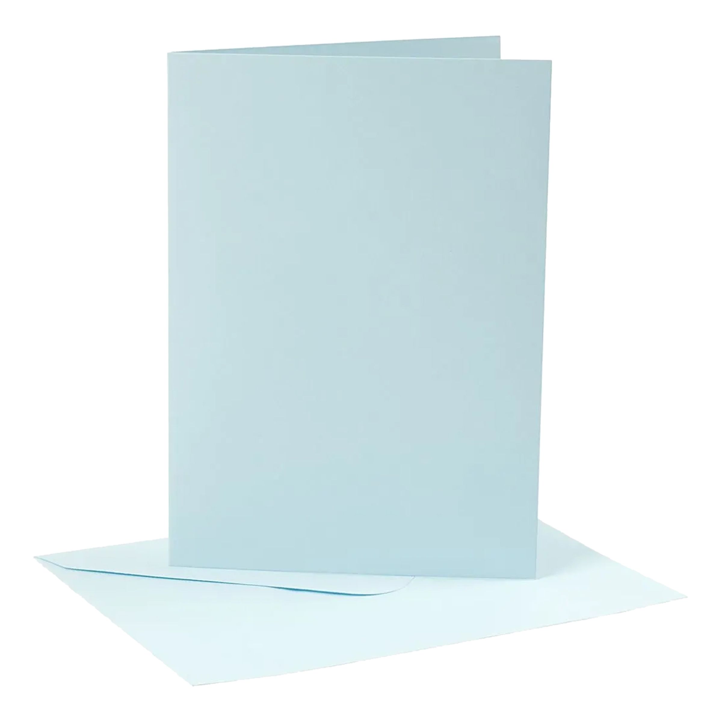 Kort med Kuvert Ljusblå inkluderar fyra dubbelvikta kort med matchande kuvert. Korten och kuverten är rektangulära och kommer i en vacker ljusblå nyans.