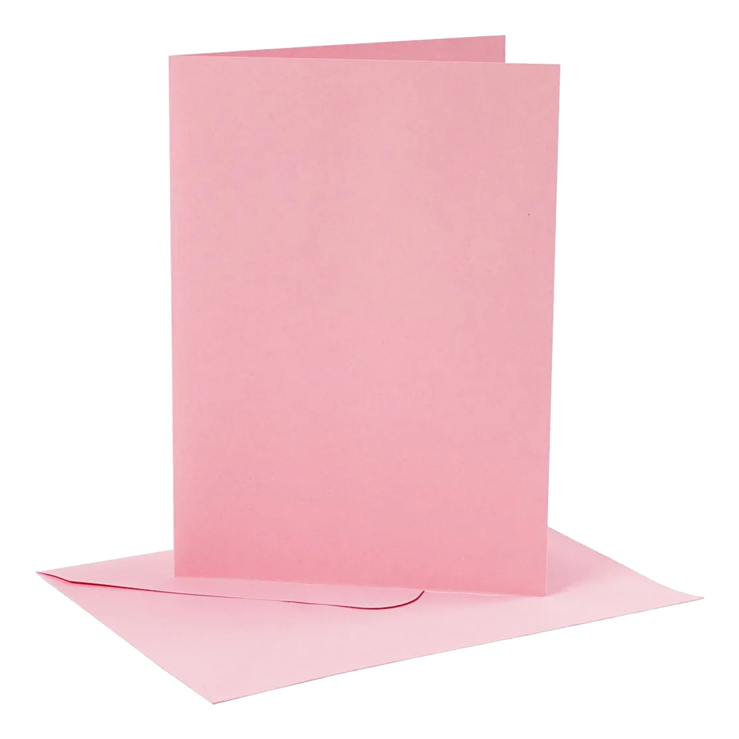 Kort med Kuvert Rosa inkluderar fyra dubbelvikta kort med matchande kuvert. Korten och kuverten är rosa och finns i två olika storlekar.