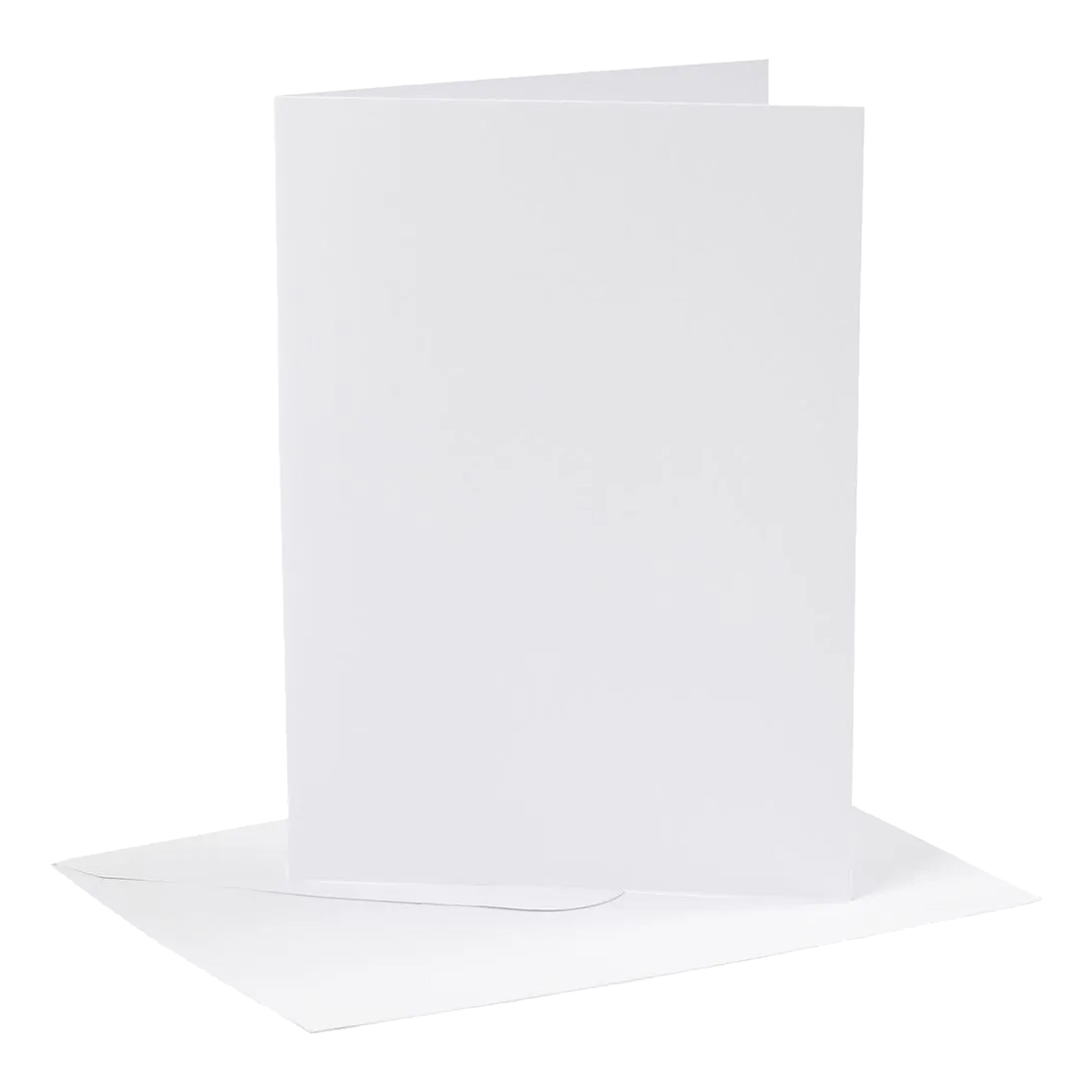 Kort med Kuvert Vit inkluderar dubbelvikta kort med matchande kuvert. Korten och kuverten är vita och finns i två olika storlekar.