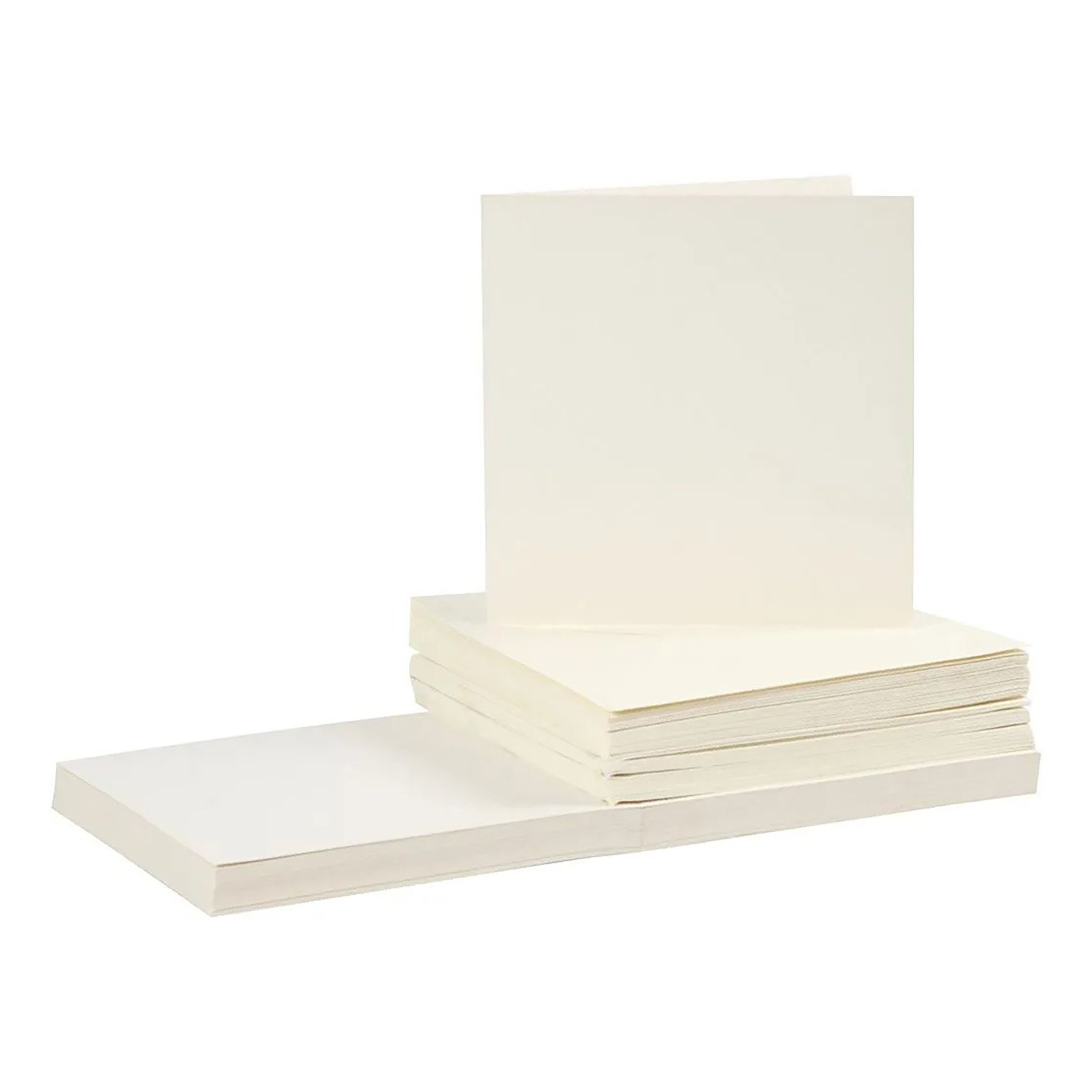 Kort och Kuvert Råvit Kvadratisk inkluderar totalt femtio kvadratiska kort med tillhörande kuvert. Korten kommer tillverkade av tjockt och kvalitativt papper och kuverten förseglas med fukt.