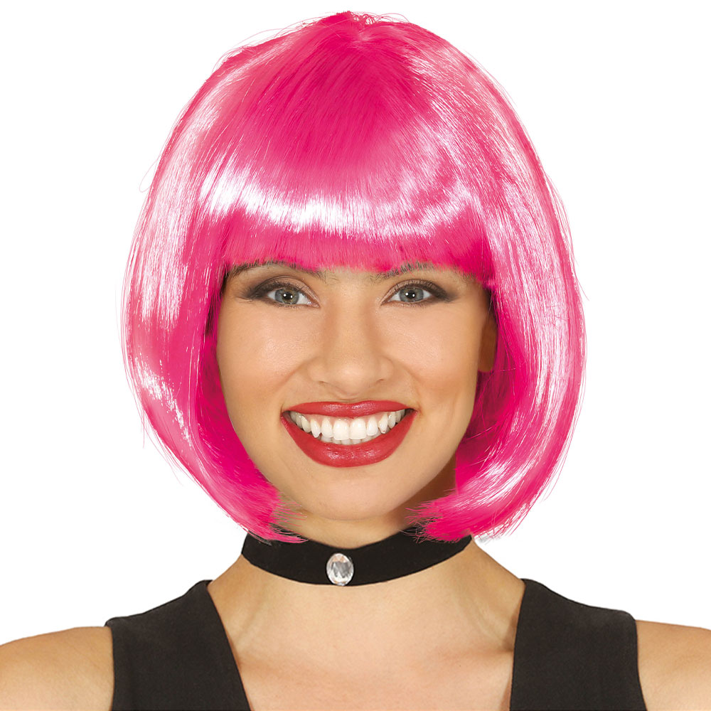 Kort Peruk med Lugg Rosa omfattar en rosa peruk med kort hår och lugg.