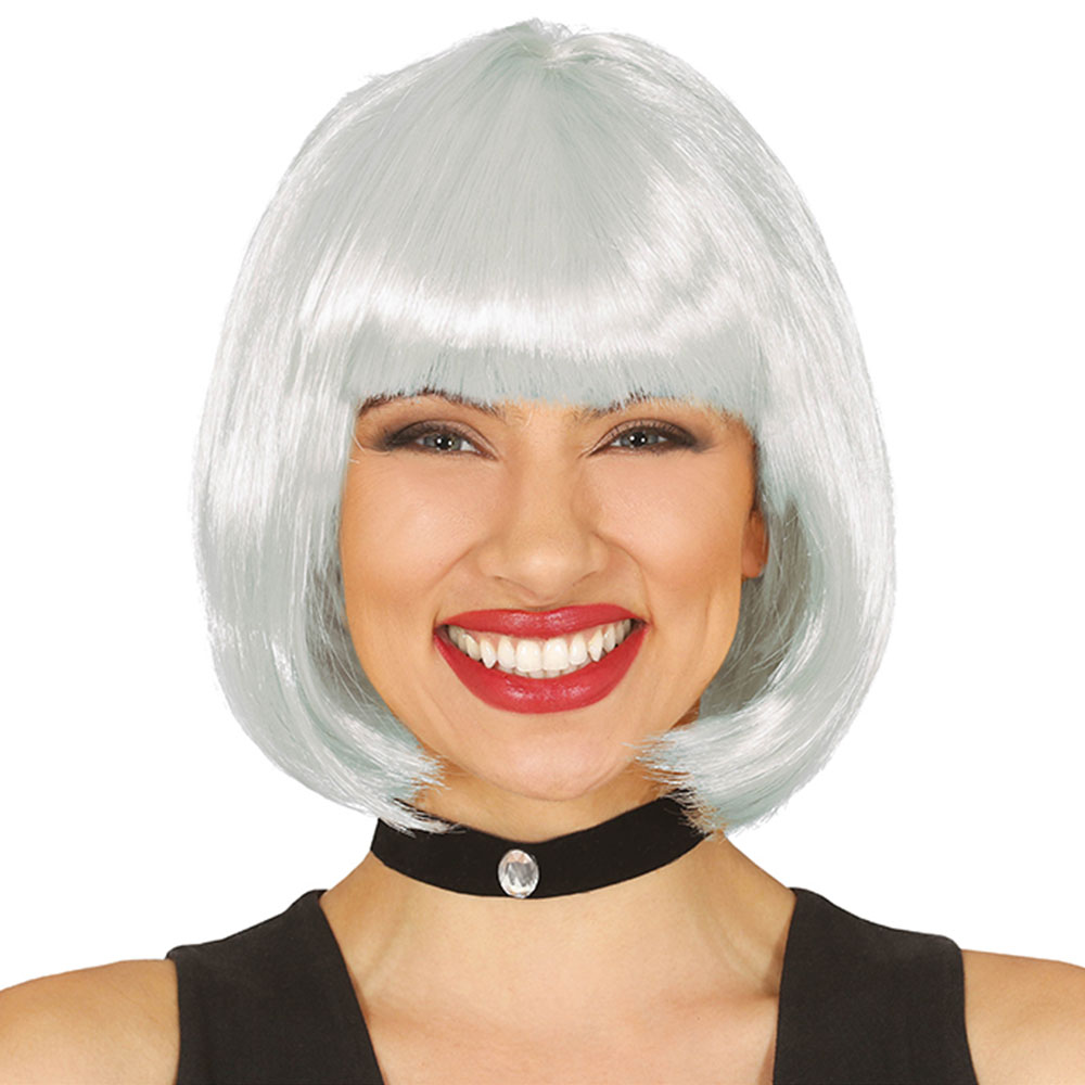 Kort Peruk med Lugg Vit omfattar en vit peruk med kort hår och lugg.