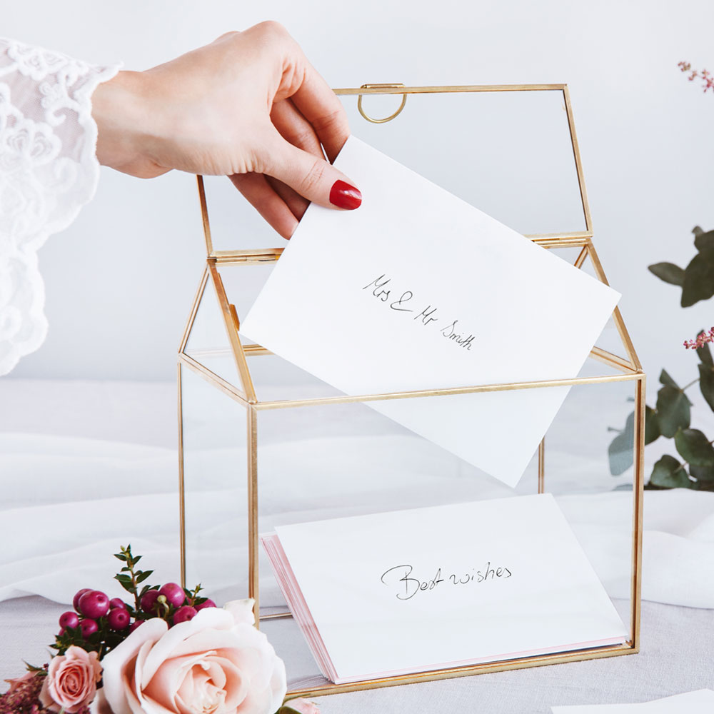 Låt alla gäster lägga sina kort och kuvert i denna fina kortbox! Dekorativ kortlåda av glas med guldiga kanter som inte bara samlar in alla kort, utan också blir en fantastisk dekoration till presentbordet. När festen är slut kan du även använda lådan som en fin inredningsdetalj i ditt hem. Helt enkelt en perfekt kortlåda för dig som vill dekorera både hemmet och festen.