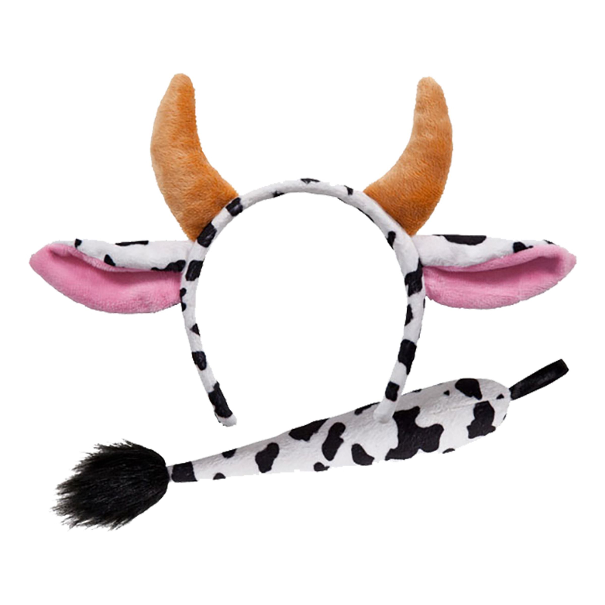Kossa Tillbehörskit Barn inkluderar ett diadem med öron och horn samt en uppstoppad svans med svartvitt komönster. Kommer i en storlek som passar barn.