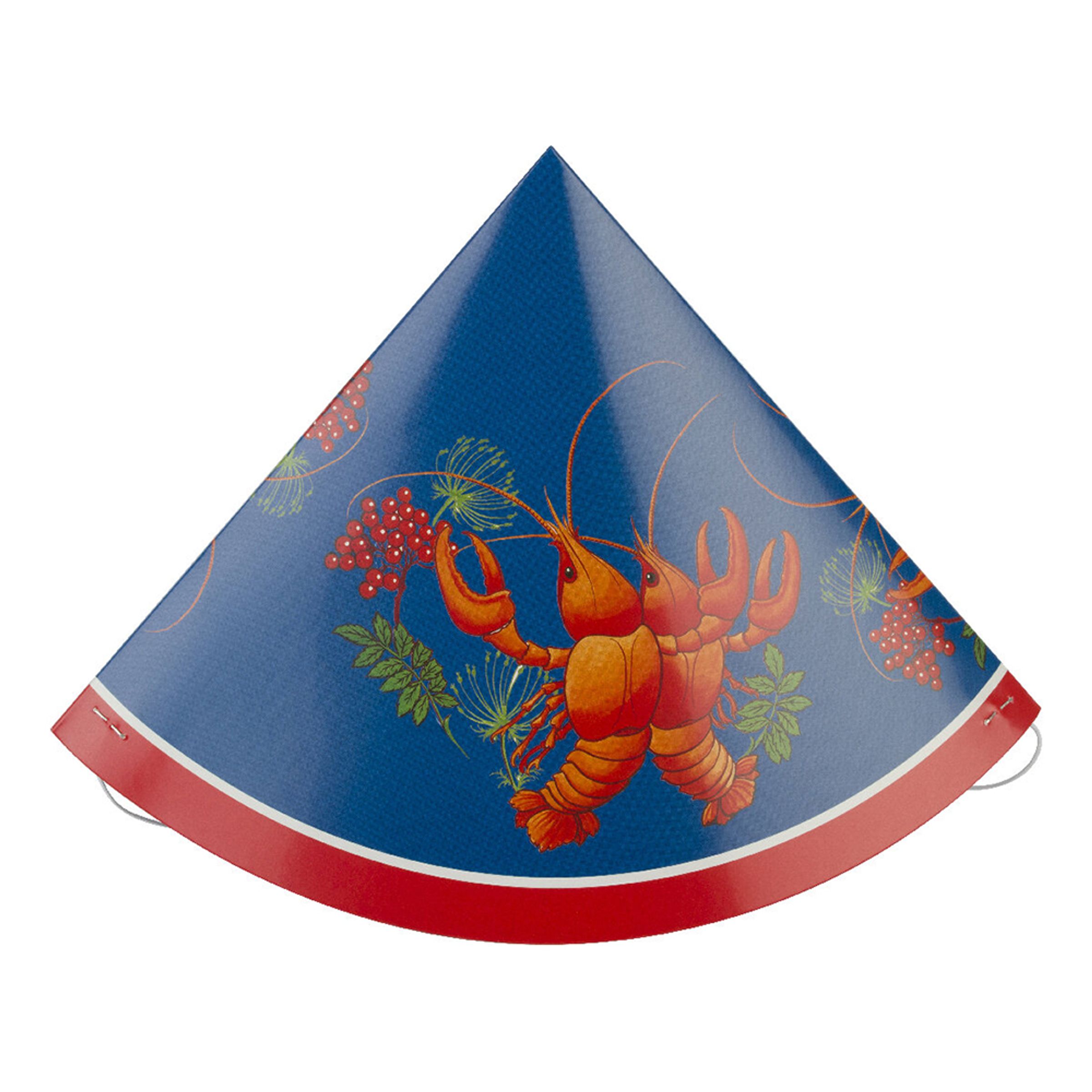 Kräfthattar Blå är vanliga pappershattar med resårband som du faster hatten med på ditt huvud. Hatten är blå med röda motiv av kräftor. Levereras i 4-pack.