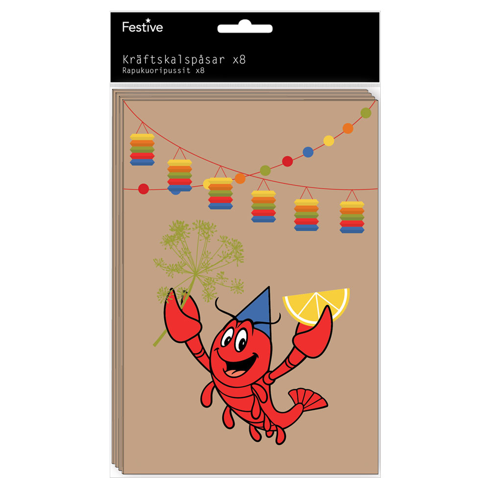 Kräftskalspåsar omfattar 8 st bruna kräftskalspåsar av papp med festligt motiv av en glad kräfta på kräftfest.