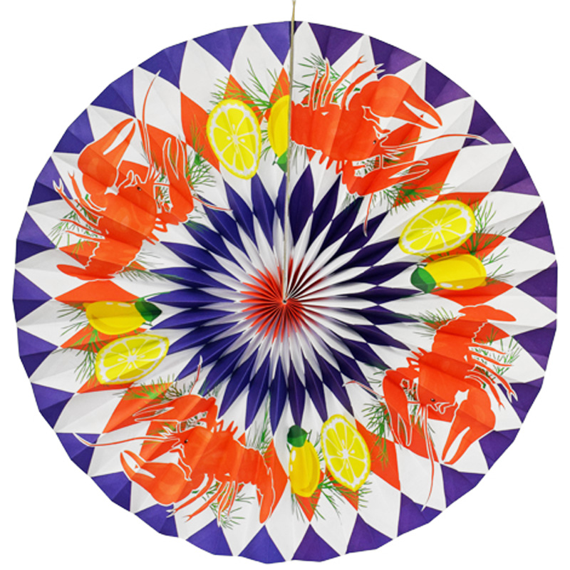 Kräftskiva Dekorationsfjäder omfattar en dekoration i vit och blått med vackra motiv av kräftor, dill och citroner. Dekorationen hängs upp på valfri plats på kräftskivan med hjälp av det vita snöret som sitter fast på lyktan. Tillverkad i papp.