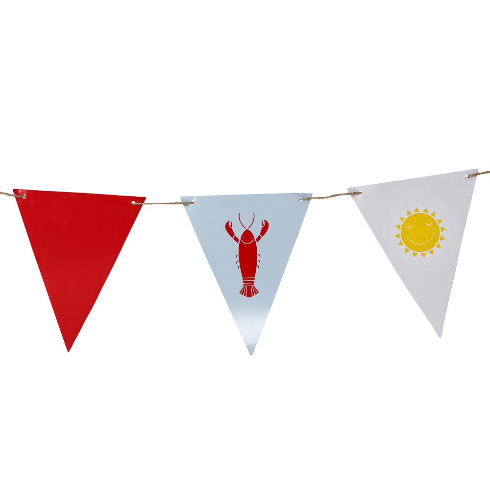 Gör din kräftskiva riktigt stämningsfull med denna tjusiga girlang som dekoration över festbordet! Med härliga nyanser av vitt, blått och rött samt fina motiv av kräftor och solar blir den här girlangen en utmärkt dekoration till varje kräftfest.