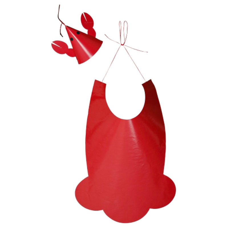Kräftskiva Haklappar och Hattar innehåller röda kräftskiva haklappar och hattar för fyra personer. Haklapparna och hattarna har röda elastiska band som håller dem på plats.