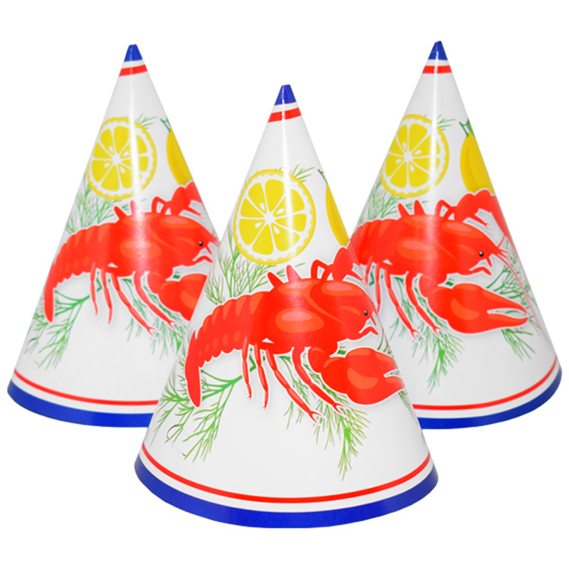 Kräftskiva Partyhattar innehåller 6 stycken partyhattar med snyggt kräftskive-mönster i blått, vitt och rött. Hattarna fästs enkelt på huvudet med hjälp av de vita elastiska banden som sitter fast i hattarnas sidor. Hattarna är tillverkade i papp.