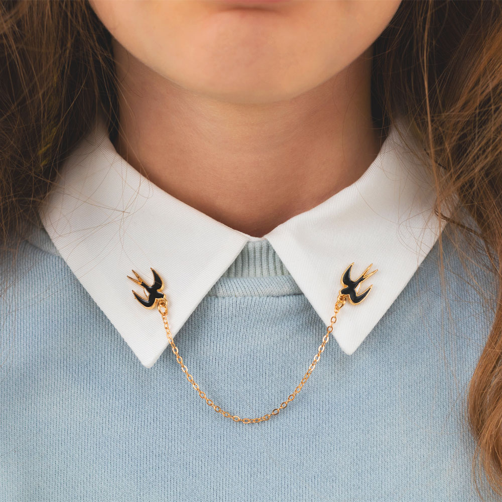 Piffa till dig med ett snyggt kragsmycke i form av två vackra svalor sammanlänkade via en guldkedja. Denna kragkedja blir en fin och annorlunda accessoar, perfekt collar pin för alla som gillar fåglar och speciellt svalor.