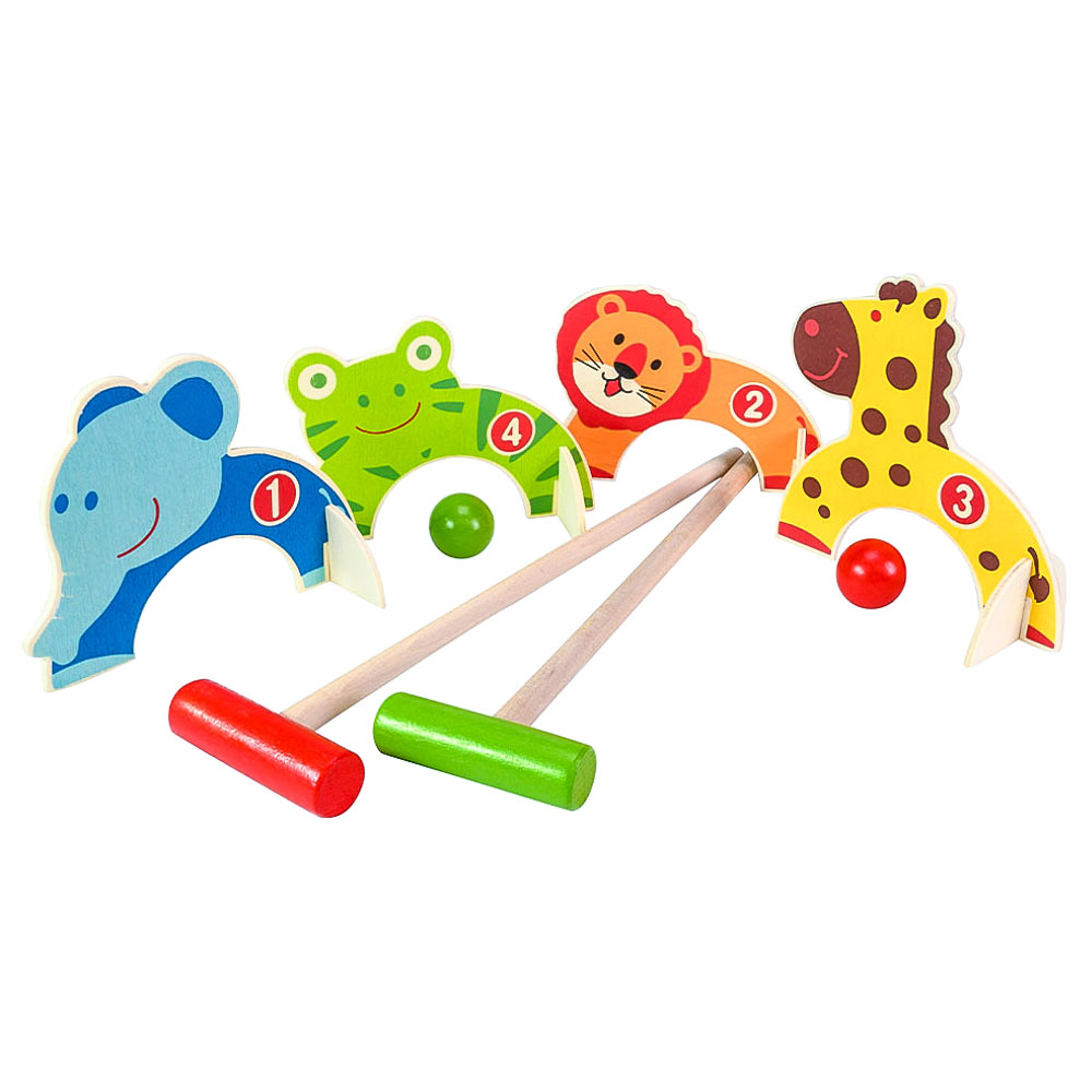 Krocket Spel Djurmotiv består av ett spel med två klubbor, två träklot och fyra djurportar. Den som slår sitt klot genom portarna i rätt ordning först vinner. Klubborna mäter 42 centimeter långa och kloten har en diameter på 4 centimeter.