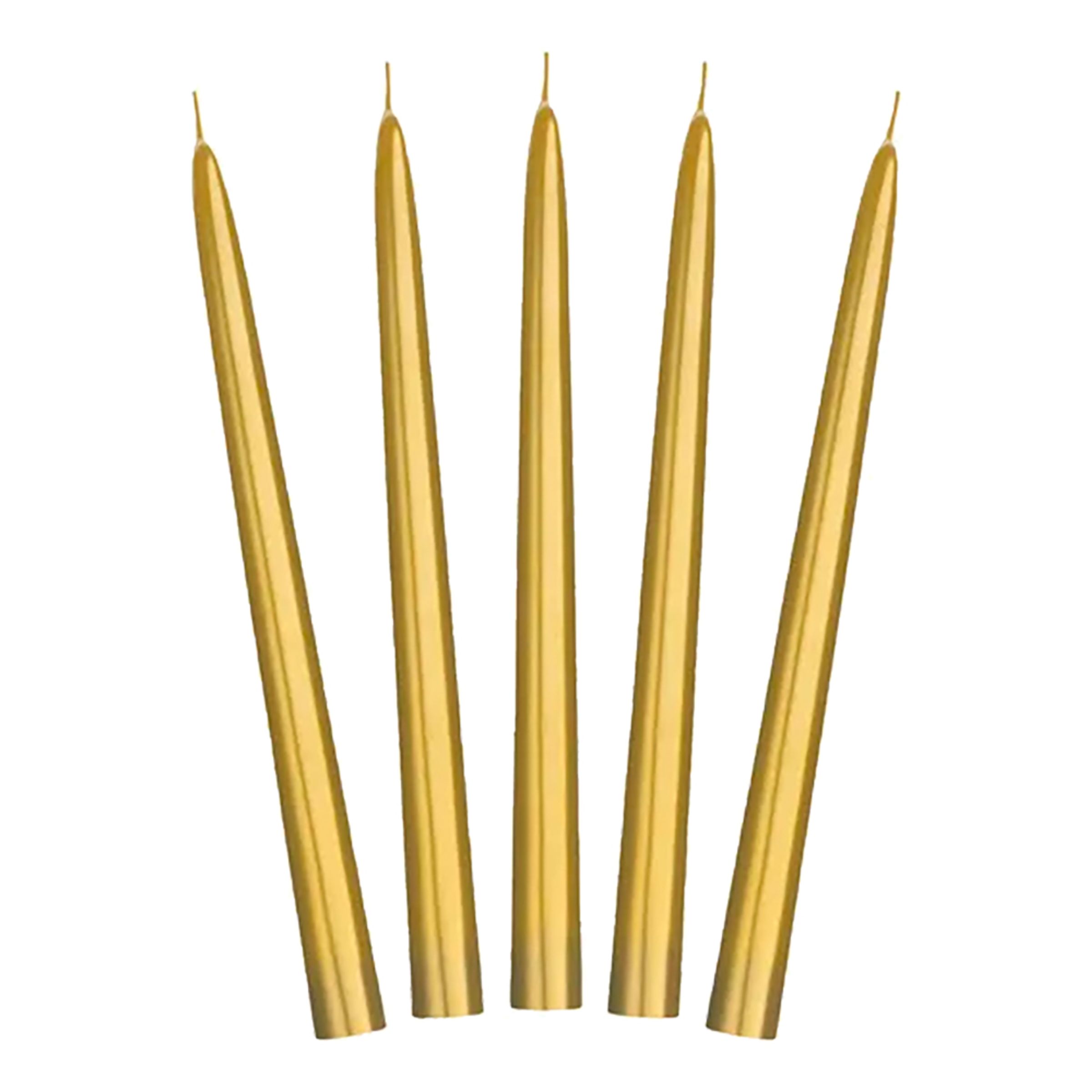 Kronljus Guld Metallic är långa, avsmalnade ljus, med en guldfärgad metallic finish. Passar utmärkt att använda som en stämningsfull dekoration till exempelvis adventsljusstaken i jul, bröllopet eller till vardags som mysbelysning.