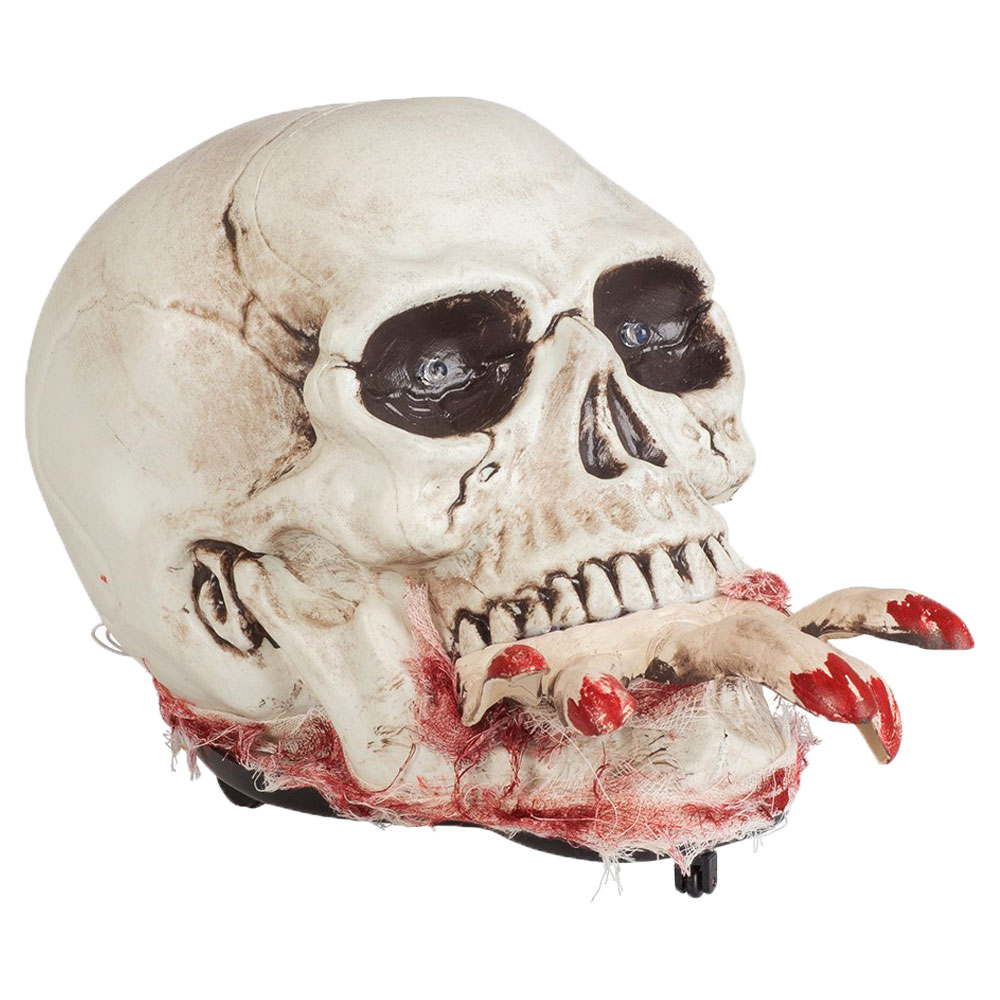 Krypande Dödskalle Halloween Prop omfattar en halloweendekoration i form av en dödskalle med en skeletthand i munnen. Dödskallen har lysande, röda ögon och kryper framåt samtidigt som den ger ifrån dig ett läskigt ljud.