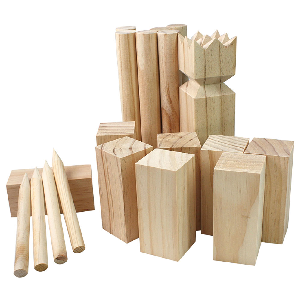 Kubb Utomhusspel består av ett spel med tio kubbar, en kungkubb och fyra hörnpinnar. Träffa träkubbar genom att kasta pinnar på dem, slå ner kubbarna och först när de ligger ner får du slå ner kungen. Fäller ditt lag kungen för tidigt så förlorar ni.