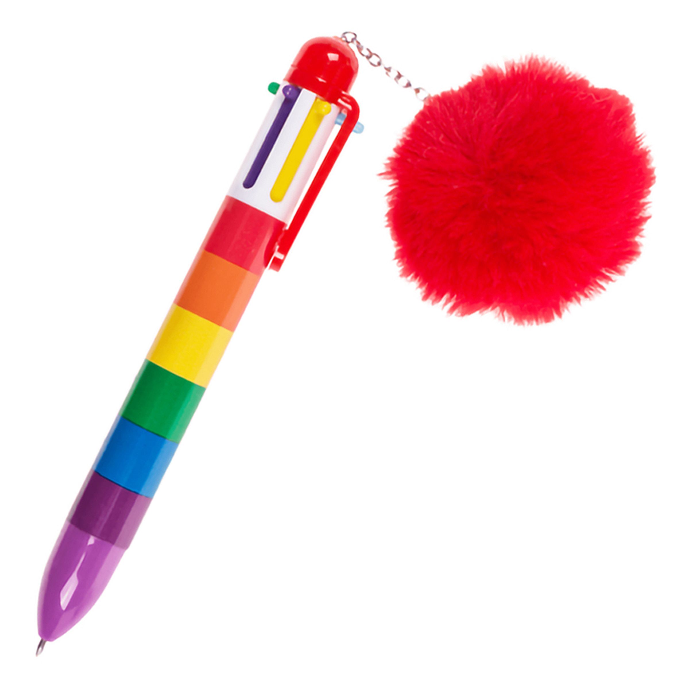 Kulspetspenna Flerfärgad är en bläckpenna med färgerna röd, orange, gul, grön, blå och lila. På toppen av pennan hänger en röd pom pom.