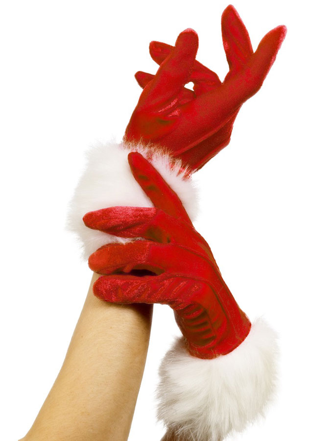 Kvinnliga Tomtehandskar Korta omfattar ett par korta, rödfärgade handskar i sammetkänsla med vit fuskpäls.