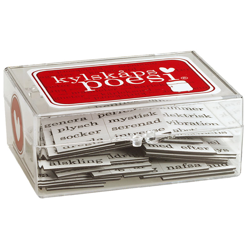 Kylskåpspoesi Kärlek omfattar 360 st vita magneter med kärleksfulla ord i svart. Blanda de olika orden för att skapa romantiska texter på kylskåpet. Magneterna är ca 0,8 – 3 cm stora och kommer i en dekorativ ask.