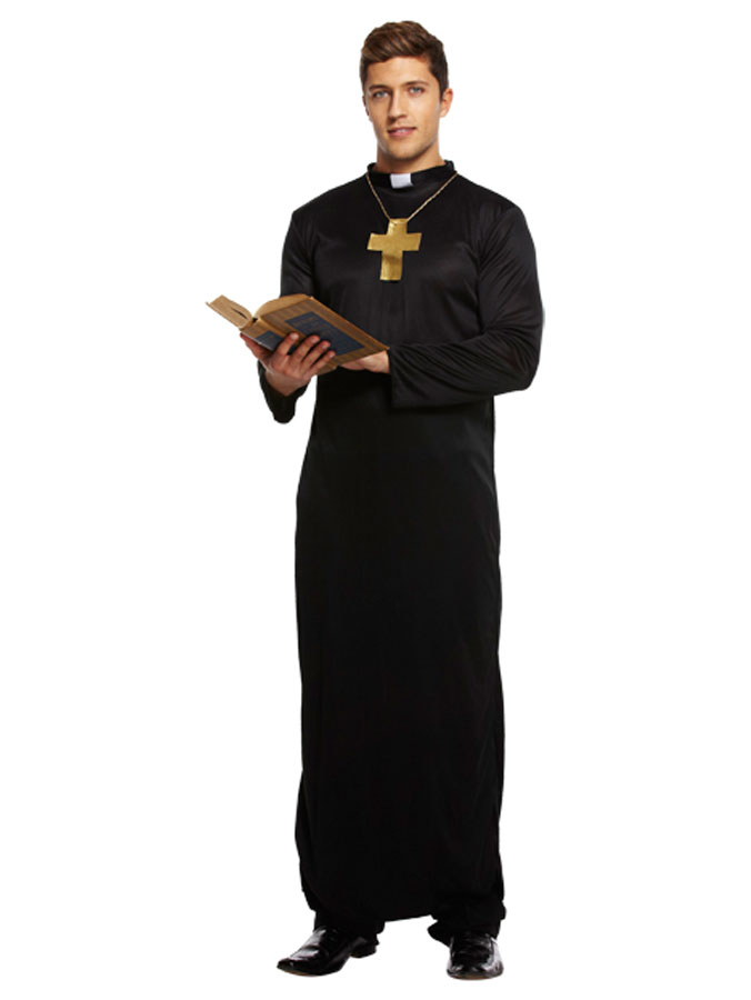 Kyrkoherde Maskeraddräkt omfattar en lång svart prästdräkt med vit prästkrage samt ett halsband med ett mjukt guldkors. Dräkten är tillverkad i polyester och passar vuxna.