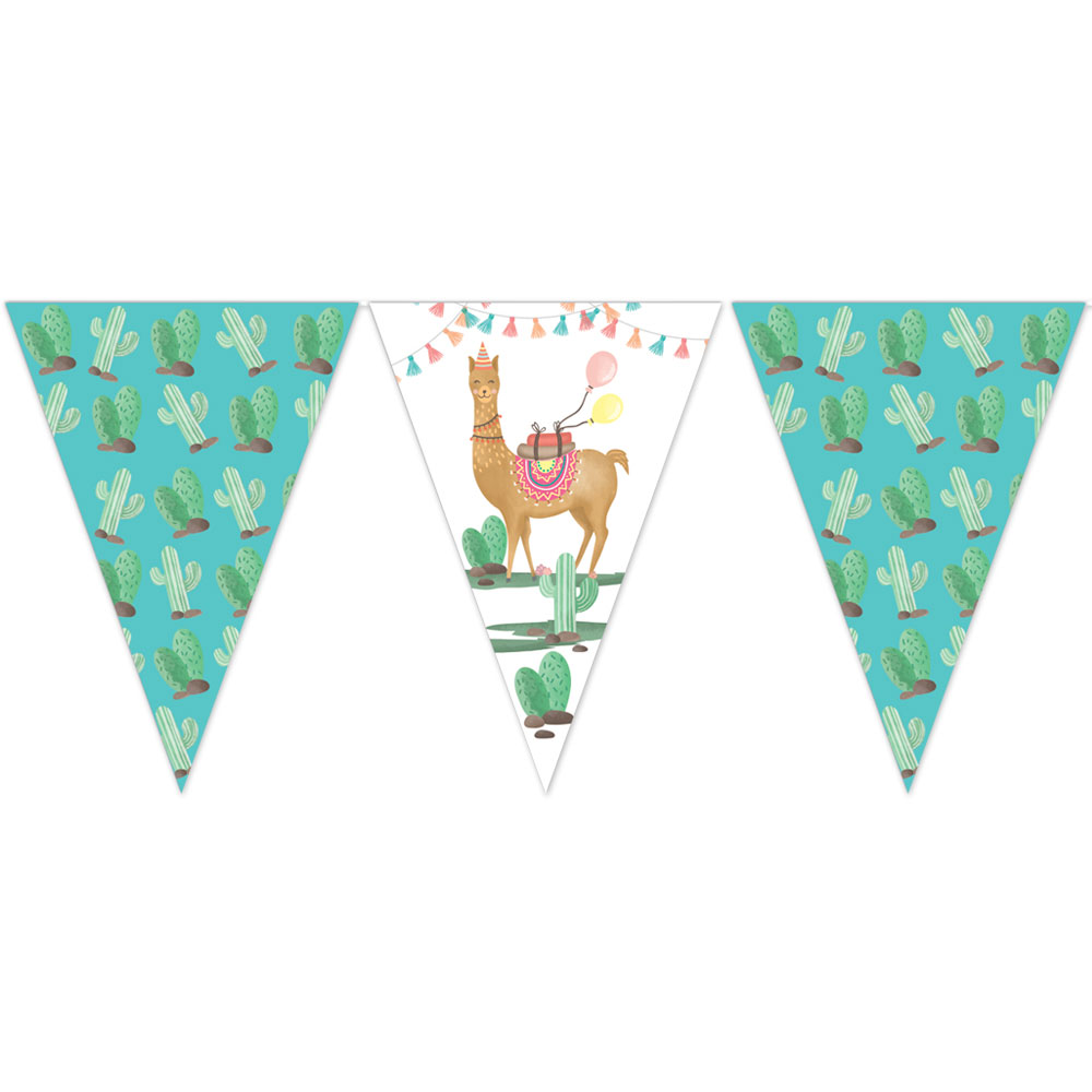 Lama Party Flaggirlang består av en flaggirlang med motiv av kaktusar och lamor med partyhattar, paket och ballonger. Tillverkad i plast.