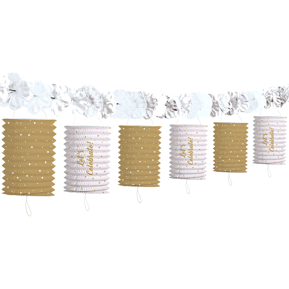 Denna lampgirlang med rislampor är skapad för att du ska kunna fira något stort, kanske är det ett bröllop och du behöver en bröllopsdekoration utöver det vanliga eller så kanske du vill ha en vacker girlang med papperslanternor när du firar nyår! Dessa papperslampor och vackra blommor passar verkligen in som hängande dekoration på vilket firande som helst tack vare sin snygga färg och texten som lyder "Let's Celebrate!".
