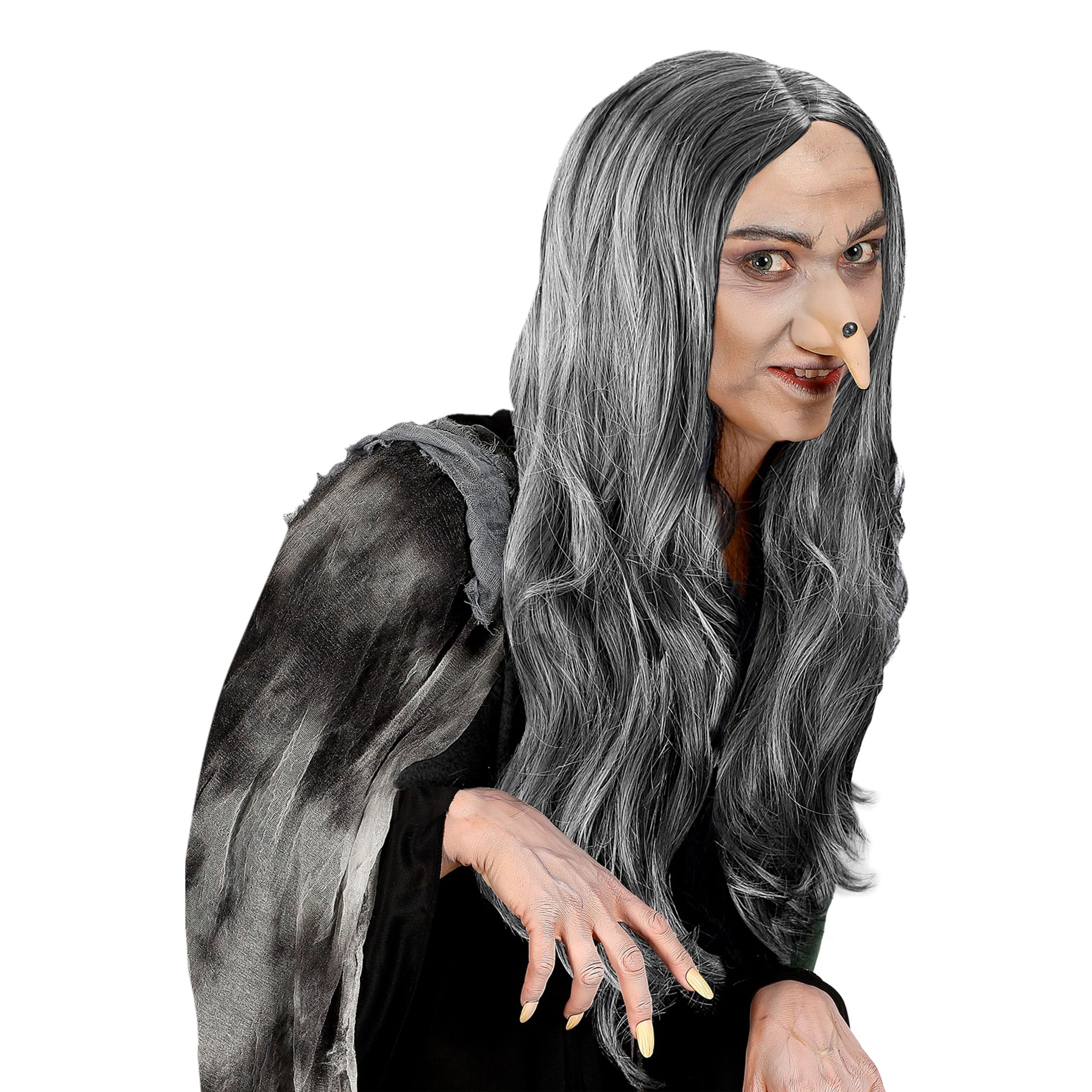 Lång Grå Peruk är en grå lång peruk med vågigt hår nertill. Peruken är fin att använda som den är, men passar även bra att ha under häxhatten på halloweenfesten. Komplettera gärna med peruknät så den sitter på plats kvällen lång!